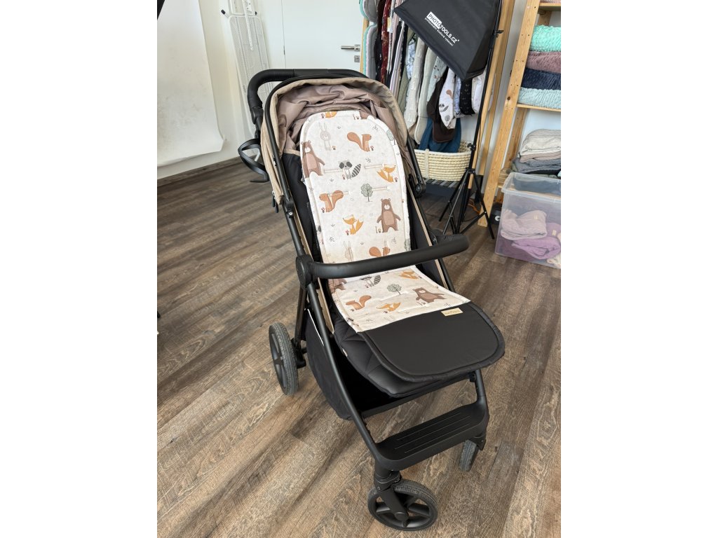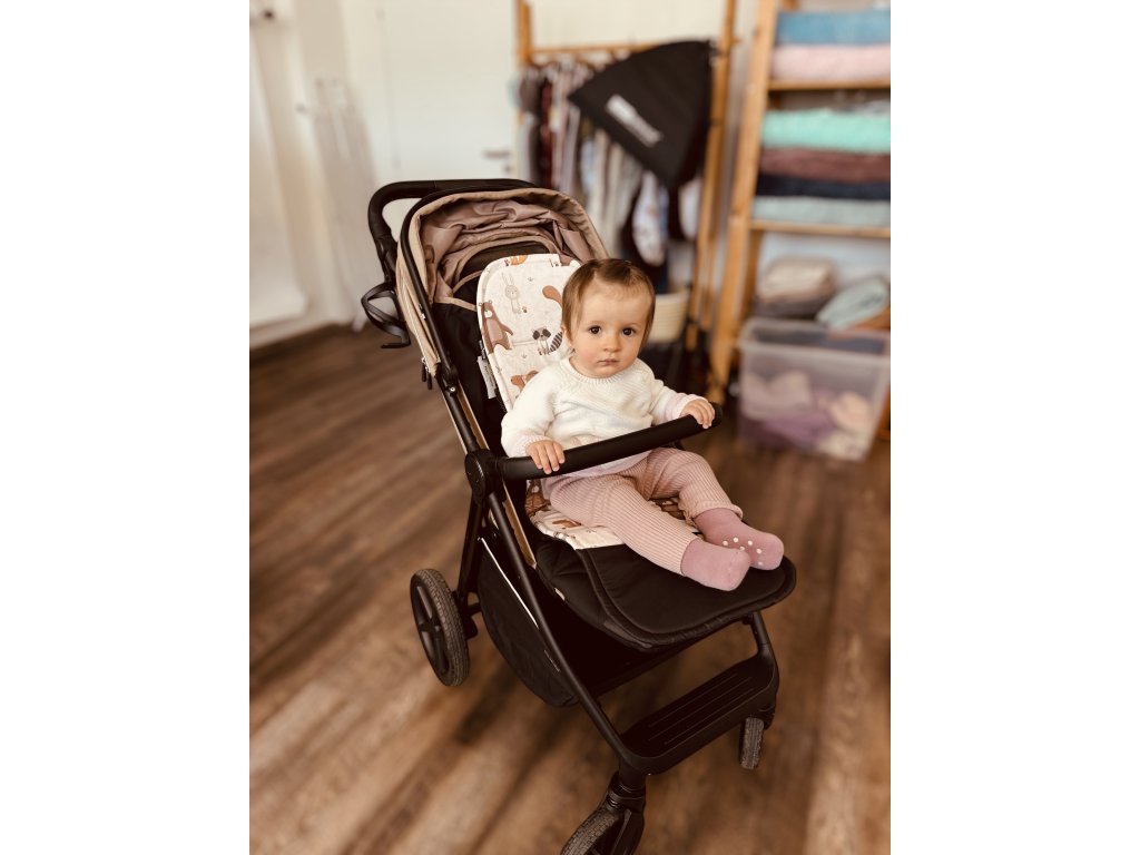 Podložka je oboustranná, dole je všitý omyvatelný šusťák v případě ušpinění od botiček. Díky důmyslnému prošití podložka dokonale kopíruje kočárek a tlumí tak případné otřesy. Funguje jako pohodlná vložka do kočárku a zajistí děťátku pohodlí i stabilní sezení při jízdě.